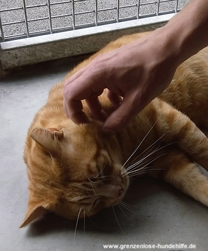 Er ist ein ganz offener zugänglicher Bursche der gleich angerannt kommt, wenn man das Katzengehege betritt.