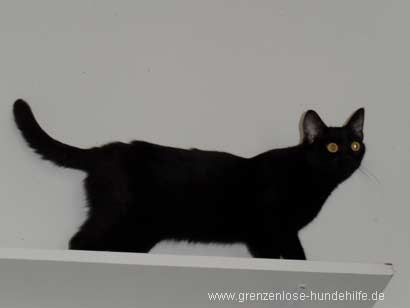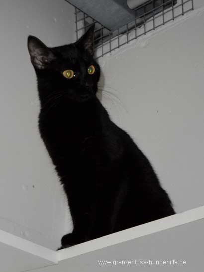 Von Chipie sieht man als erstes ihre ausdrucksstarken Augen mit denen sie einem freundlich mustert. Sie ist eine zierliche schwarze Katze, die sehr neugierig ihre Umgebung erkundet. Chipie ist zutraulich und auch verträglich mit Artgenossen. Wer kann diesen Augen widerstehen? |