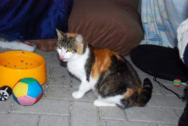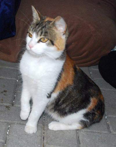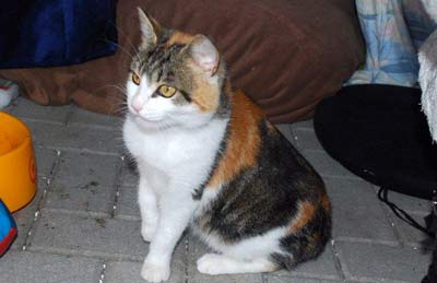 Éine ruhige Katze, dreifarbig mit etwas