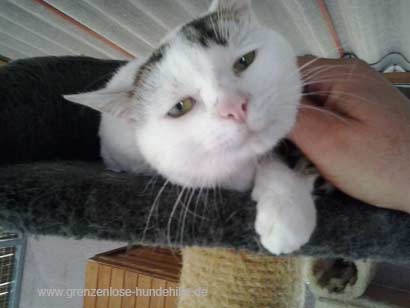 Die Entzündungen im Mundbereich konnten durch Medikament glücklicherweise heilen, jedoch hat der weisse Kater Stress.