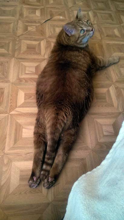 Garfield wiegt ca. 10 kg und kann sich kaum bewegen.