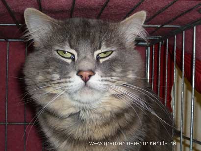 Gribouille ist sehr hübsch, aber leider verhält er sich im Käfig aggressiv und faucht.
