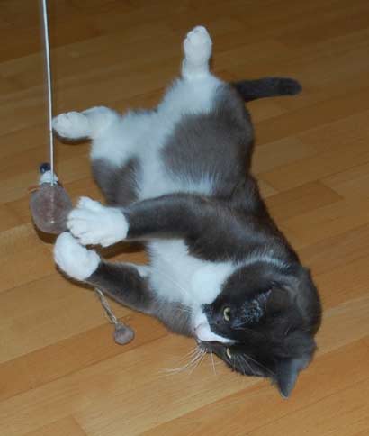 Wir haben Ihn jetzt seit 31 Tagen im Haus, er kann sich hier auf fast 150qm frei bewegen und macht nicht wirklich den Anschein raus zu wollen. Zwischendurch und Abends spielen wir etwas mit einer Reizangel mit ihm, kleine Bälle und Mäuse mit Catnip Füllung findet er sehr spannend und er spielt damit sehr gerne.