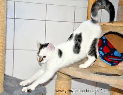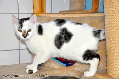 Der junge Fundkater Igor ist ein richtig schöner Kuhfleckenkater mit einer hellbraunen Nase.
