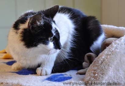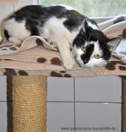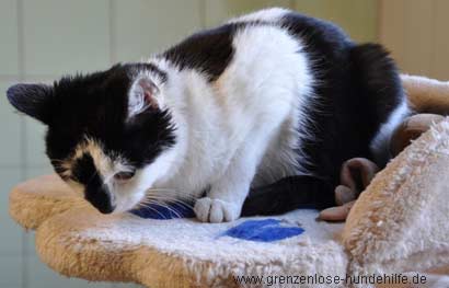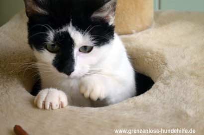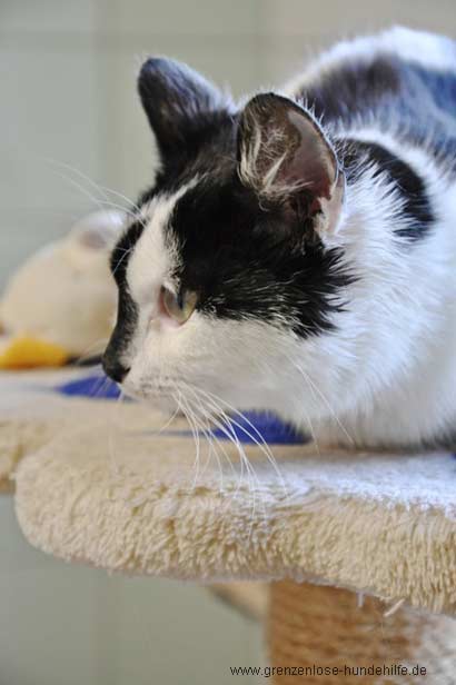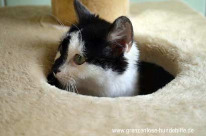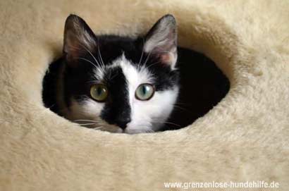 Die hübsche schwarz-weiße Kätzin Joice ist eine Fundkatze.