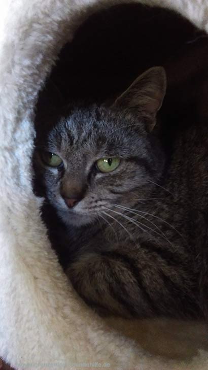 Sie ist den Umständen entsprechend noch etwas zurückhaltend und verunsichert. Wenn man sich aber mit ihr beschäftigt kommt sie schnell aus dem Kratzbaum gekrochen und lässt sich streicheln.