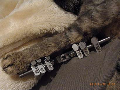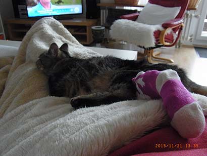 Ich habe ihr auf Anraten der Klinik eine Babysocke über das Beinchen gezogen, damit sie nicht daran lecken kann. Am 1. Dezember habe ich wieder einen Termin mit ihr in der Klinik, dann wird sich zeigen, ob der Fixateur weg kann."
