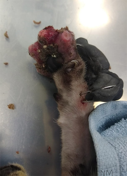 Bei der Erstuntersuchung stellten wir sofort fest, dass mit ihrer Pfote etwas nicht stimmt.