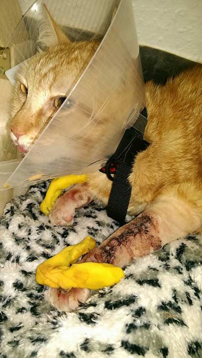 ... kaum war die eine Katze versorgt, wurde auch schon der nächste arme Kerl mit schrecklichen Schmerzen in den Vorderpfoten aufgefunden und ins Tierheim gebracht. Der Anblick dieses Häufchen Elend zerriss einem das Herz. In der Klink, in die er sofort gebracht wurde, zeigte sich das Ausmaß der Verletzung...