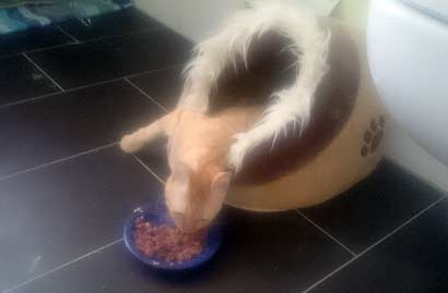 Im Moment genießt er jede Streicheleinheit die er bekommen kann und hat sich super mit seiner Situation arrangiert. Der hübsche Kater darf sich nicht viel bewegen und die Beine nicht stark belasten, aber das hat er gut raus…. Er geht einfach unter die Erdmännchen… ;)