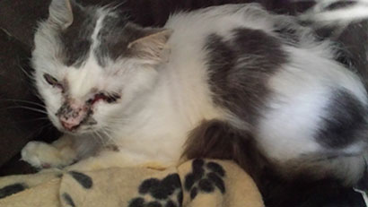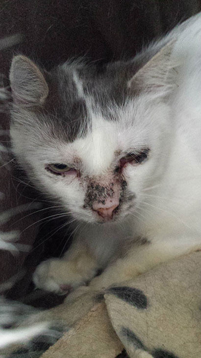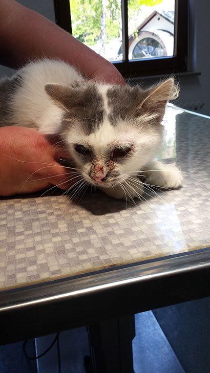 Wir werden Ihn dem Tierarzt vorstellen, da er Krusten im Gesicht hat.