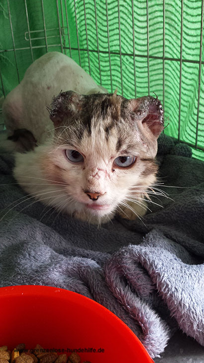 Orca hatte Ohrenkrebs, das gibt es wenn Katzen mit hellen Ohren zu sehr der Sonne ausgesetzt sind. Um seine Ohren zu retten musste leider das befallene Hautgewebe an den Ohrspitzen entfernt bzw. amputiert werden. Unglaublich was dieser Kater für Schmerzen gehabt haben muss.