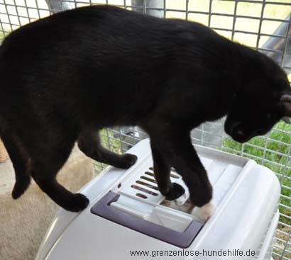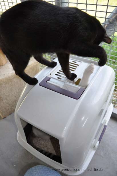 Pedro und Finess haben sich im Tierheim angefreundet und spielen sehr schön zusammen (Pedro sitzt im Katzenklo und seine Pfote kommt durch die Deckelöffnung)
