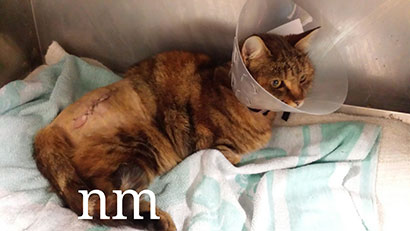 Etoile wurde schwer verletzt aufgefunden (vermutlich von einem PKW angefahren) und wurde sofort zum Röntgen und OP in die Tierklinik gebracht.