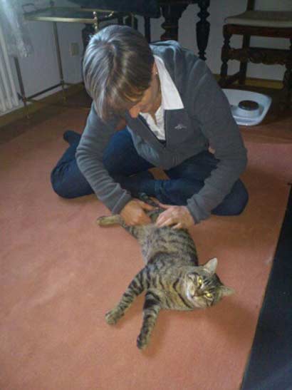 Und mindestens genauso wichtig: der Glückliche durfte gleichzeitig auf eine erfahrene und liebevolle Pflegestelle ziehen. Die Pflegestelle hat sofort die Verantwortung und Bereitschaft übernommen, die Übungen täglich fortzusetzen und unter Anleitung mit Rocky zu trainieren. Rocky ist ein Muster-Schüler, ein Vorzeigepatient, der geduldig alle Übungen mitmacht und sie sogar genießt. Oft wirft er sogar seinen Motor an und schnurrt dabei ganz laut. Offensichtlich ist dem schlauen Katerchen bewußt, wie gut die unterschiedlichen Therapien für ihn sind und wie sie ihm Besserung verschaffen-)).