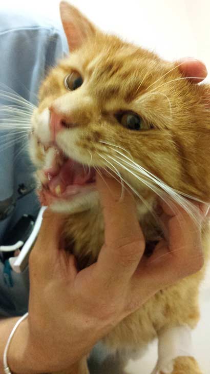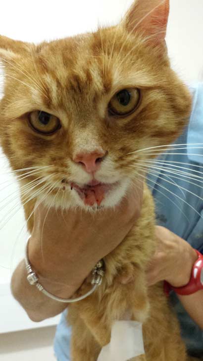 Sein Unterkiefer ist gebrochen und er kann nicht mehr fressen. Der Arme muss große Schmerzen haben, trotzdem ist er ein sehr lieber umgänglicher Kater.