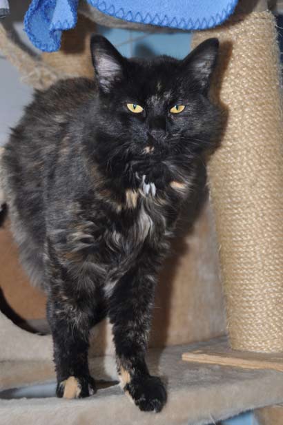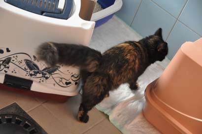 Die zwei anderen Katzen im Raum scheint sie toll zu finden, sie begegnet ihnen ganz freundlich. Nach dem "Fototermin" spielt sie mit den Steinchen im Katzenclo; wenn es schon kein Spielzeug gibt, dann hilft man sich halt anderweitig-). |