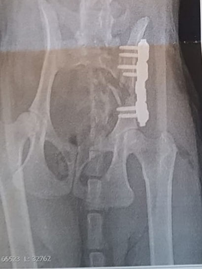 Inzwischen ist der junge Tigerkater operiert und im Endeffekt hatte er nicht nur einen Beckenbruch links, welcher mit zwei Platten und sechs Schrauben fixiert wurde, nein er hatte rechts auch noch eine Luxation des Iliosakralgelenks, welches aber zum Glück nicht extra chirurgisch berichtigt werden musste.