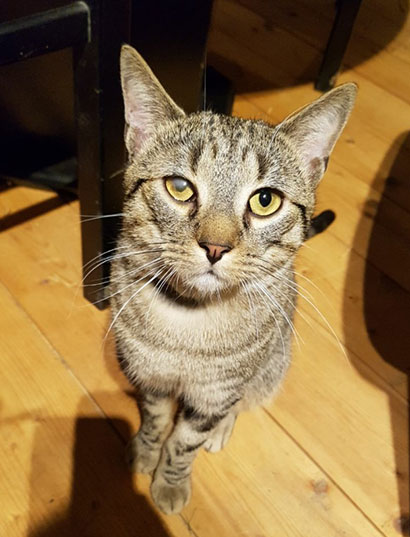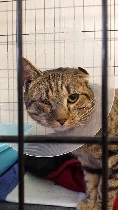 Spoky wurde gefunden und leider hat sich im Tierheim nach der Kastration ein Absess unter der Hornhaut gebildet.
