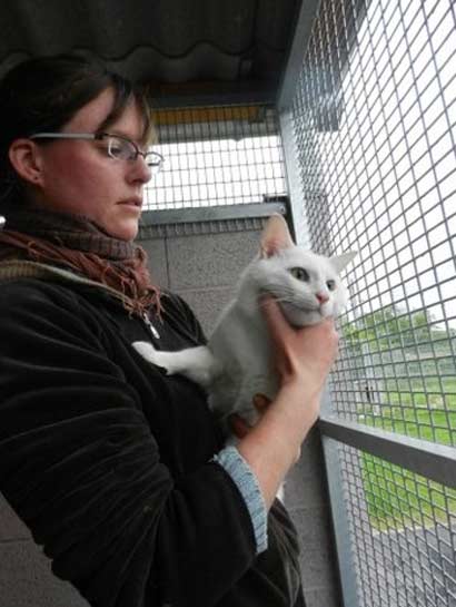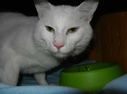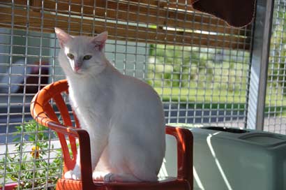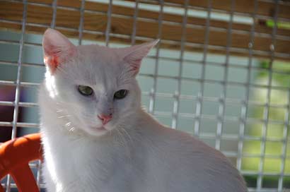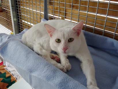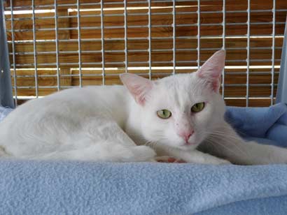 Leider ist der schöne, weiße Sugar mit den grünen Augen seit heute wieder im Tierheim zurück. Unglücklicherweise hatte er höllische Angst vor dem Hund der neuen Familie. Da er dort vor lauter Panik hinter dem Kühlschrank lebte, hat die Familie es vorgezogen, ihn wieder zurück zu bringen.
