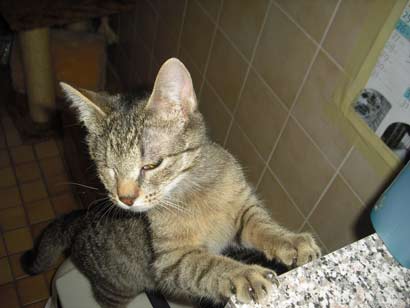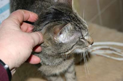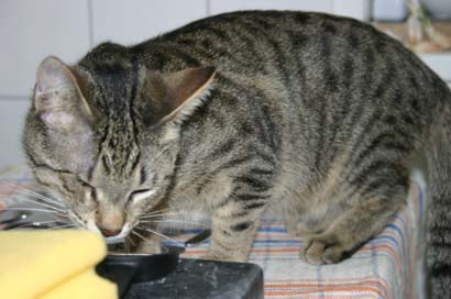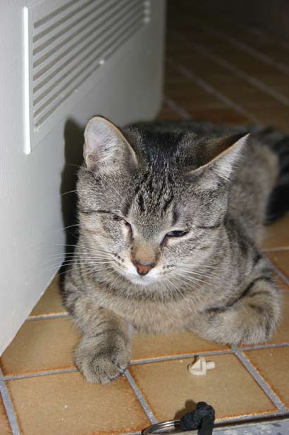 | Neue Infos von den beiden hübschen Kätzchen: Heute wurde ich mit einem kaum wahrnehmbaren iiiikkk (sollte wohl ein Miau werden) zur Futtergabe unter Schnurrprotest aufgefordert und beim Türöffnen muss man jetzt aufpassen das Timo sich nicht rausdrängelt. Jedoch hat sich das etwas geändert, da ich die Augensalbe verabreichen mußte - sehr zum Unverständnis aus Katzensicht. (Da ab und zu sich so ein Schmierfilm über einem oder beiden Augen liegt ist das unumgänglich) Ohjjjee dacht ich, das war's dann wohl mit Vertrauen.... er kam beim nächsten Türöffnen zwar nicht angerannt war dafür trotzdem mit Kampfkraulen (so schnell um die Hand drehen das die Finger beim kraulen gar nicht mitkamen) mit Köpfchen ran drücken und mit Tatzenstupfen mit Krallen beschäftigt. Nadine hat solange Mindestabstand eingehalten - in Wartehaltung was denn hier wohl so läuft. |