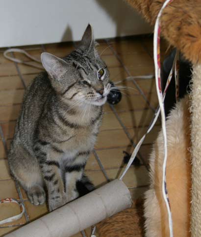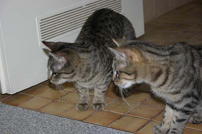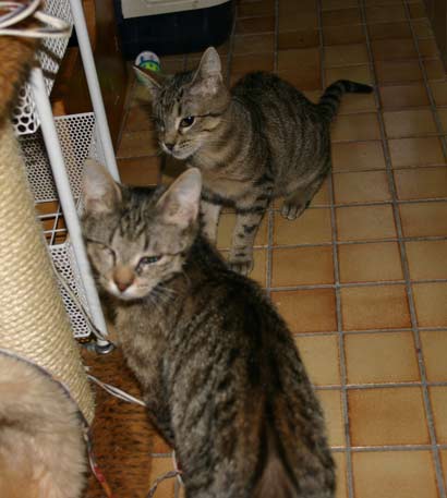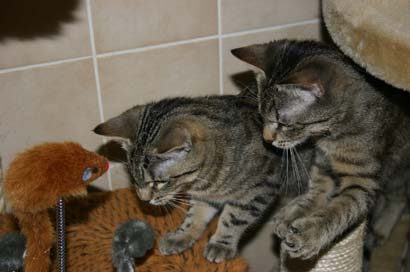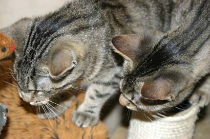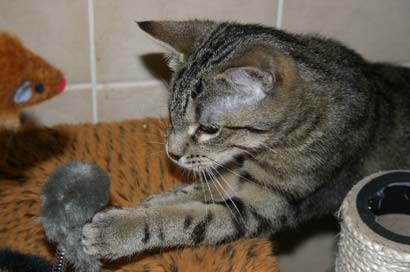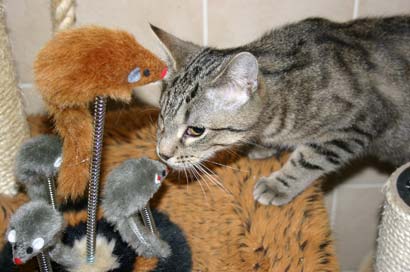 Sie haben ein Spielzeug erkundet mit 4 Mäusen. Nadi blieb im Hintergund bis Timo das Spielzeug begutachtet hatte und weg ging. Dann kam sie sehr vorsichtig und bepfotelte es in Zeitlupentempo. Inzwischen kam Timo zurück um es wie einen Boxer mit der einen Pfote duff, duff,duff nach kurzen schauen mit der anderen Pfote duff,duff,duff zu treffen. Daraufhin kam Nadi um doch mal zu sehen ob diese Maus nicht essbar ist...... |