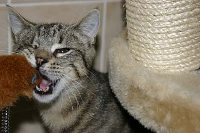 Aber wenn Spielstunde ist vergessen beide Ihre Ängstlichkeit. Timo konnte ich bis letzte Woche mit den Händen nicht anfassen. Regelmäßig kommt er und streicht mir gurrend um die Beine (Futter geben) beim Spielen kann ich sie ein bißchen streicheln und heute morgen durfte ich Ihn bei der Begrüßung sogar ausgiebig am Kopf und Rücken kraulen. Nana`s erster Kommentar zu mir - faucht mich an - und sagt somit bis hier und nicht weiter. Aber seit dieser Woche bleibt sie und rennt nicht gleich wieder weg. Beide sind liebe Katzen die etwas Zeit und Ansprache brauchen. Spielt Timo mit meiner Hand so läßt er die Krallen eingefahren und beißt auch ganz zaghaft in den Finger.