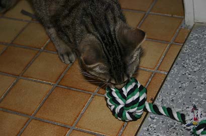 Es kostete einige Überredungskunst Caline zu überreden (war nicht möglich) dass dies ein Katzenspielzeug ist. Aber nach dem langen Zuschauen war sie zur Erkenntnis gekommen, dass dies auch etwas für sie ist und mußte erstmal ausgiebig gekostet werden .. und wer sagt das die Schnur nur für Katzen ist?? |