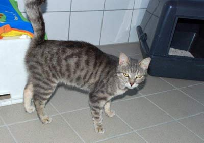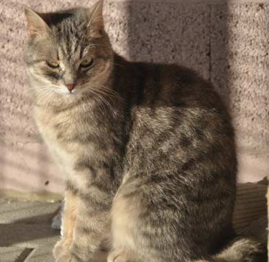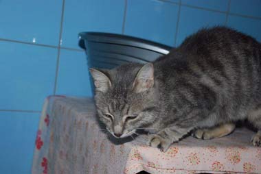 Das ist die nette Katze Triplette (geb. 9/2009). Sie ist grau getigert, einfach lieb und angenehm. Die anderen Katzen braucht sie nicht unbedingt - dafür hätte sie gerne ein Haus mit Garten und Freigang.