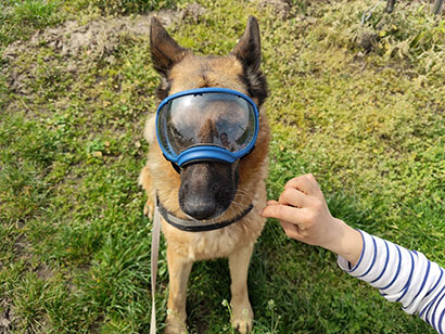 Da die Brille wie ein Maulkorb befestigt wird, muss sich der Schatz auch an den Riemen gewöhnen, der hinter den Ohren befestigt ist.