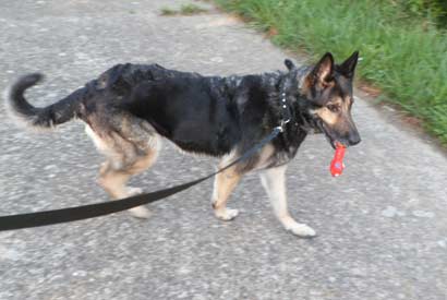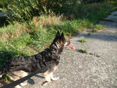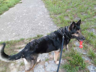 Manchmal lässt sie ihn fallen um herum zu schnuppern und wenn ich zu ihr sage “Na Lady und was ist mit dem Spielzeug”, da hebt sie es wieder auf und wir gehen weiter.