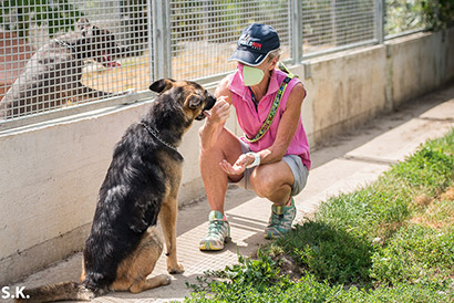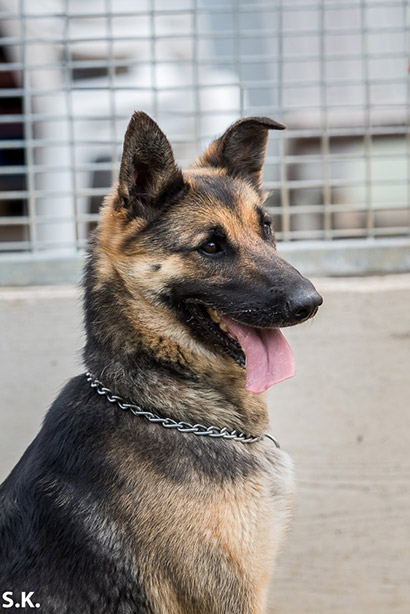 Besucht man sie im Zwinger, ist die Freude groß. Sie lässt sich ruhig anleinen und auch das Anziehen des Hundegeschirrs ist kein Problem.