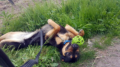 Sie beherrscht einige Grundkomandos. Die junge Hündin spielt sehr gerne Ball, ist sehr interessiert und schnell dabei Dinge zu lernen.