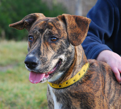 Eine junge Wirbelwind-Hündin, wunderschön gestromt mit tollen Augen. Sie heisst in France Laika und sie ist wahrscheinlich ein Boxermischling.