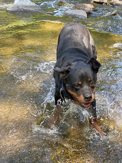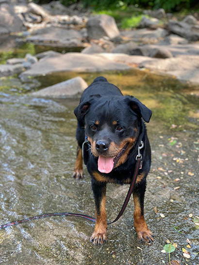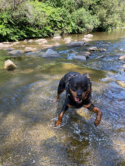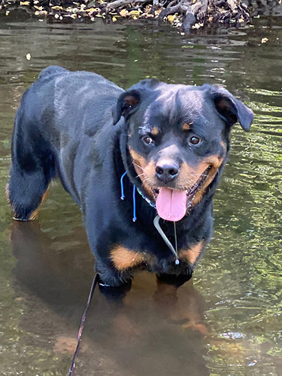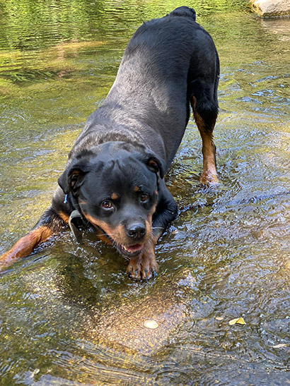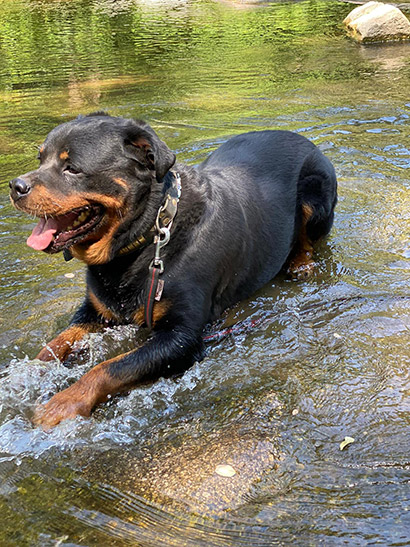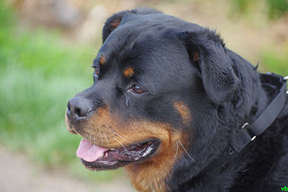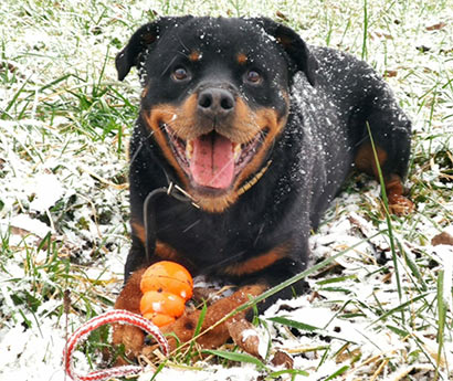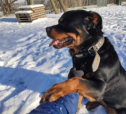 Selbst wenn er vor Übermut mit den typischen Rottigeräuschen ;) an einem hochhüpft ist er dabei gutmütig und gut zu händeln.
