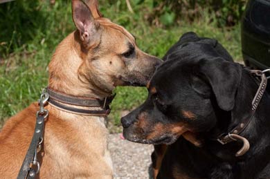 Heute bekam Lola ganz besonderen Besuch: der ehemalige Colmaraner Neros (der jetzt Mony heisst) war da, um mit ihr spazieren zu gehen. Die Beiden haben sich auch ganz wunderbar verstanden, gingen gemächlich unangeleint nebeneinander her (wie es eben Hunde ihres Alters tun...) , schnüffelten gemeinsam an interessanten Stellen im Gras und natürlich auch aneinander. Monty sprach Lola Mut zu, denn auch er hat ja einige Zeit im Zwinger verbringen müssen, bevor er ein liebevolles Zuhause fand. Lola bedankte sich mit einem Hundeküsschen dafür. Und auch wir tun alles, was wir können, damit Lola endlich die richtigen Menschen findet. Sie hat es so verdient, unser Goldmädchen! |