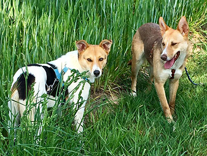 Bei den Spaziergängen (unten Fotos mit Coraline) ist Lolipop die Neugierigere und sie kann vor lauter Freude über das Rascheln in einem Grasbüschel ihre Unsicherheit vergessen.