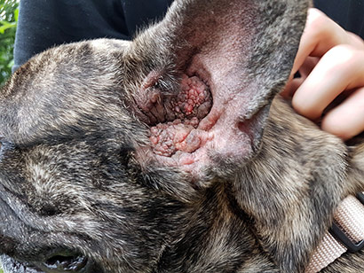 Durch permanente unbehandelte Ohrenentzündungen sind seine Ohren komplett mit Polypen zugewachsen und darunter wütet eine heftige Ohrenentzündung!
