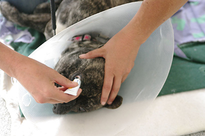 Durch die schweren Entzündungen hat das eine Auge mit gelitten und bekommt jeden Tag Tropfen.