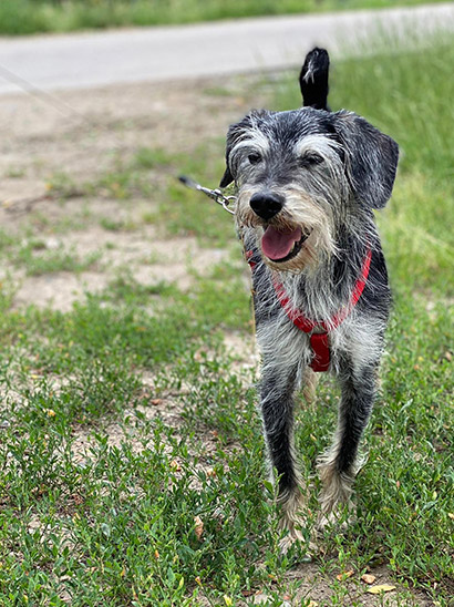 Er geht gerne spazieren und schnuppert mal hier mal da, hat bei Hundebegegnungen kein Problem und ist sehr entspannt an der Leine.