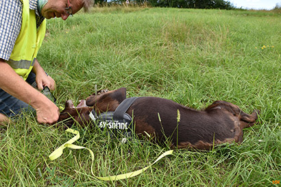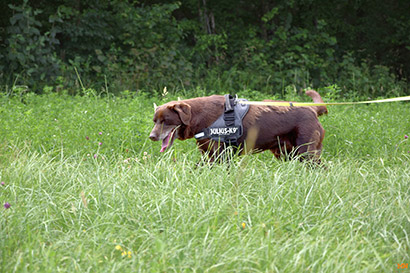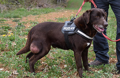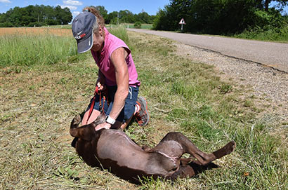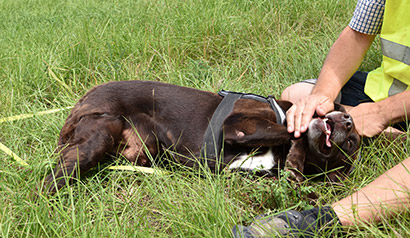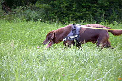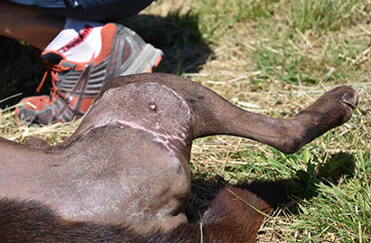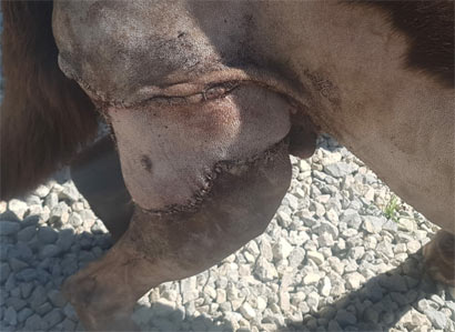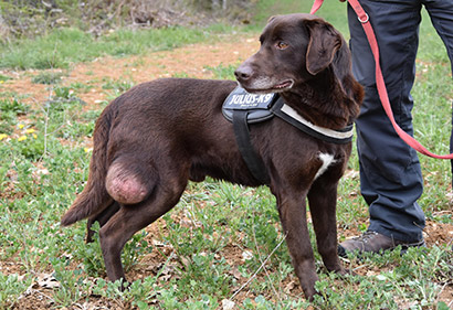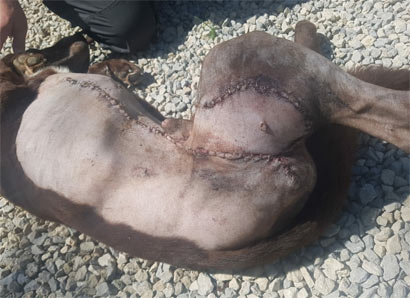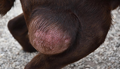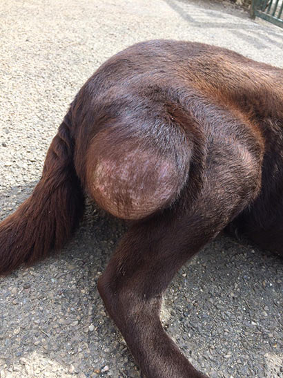 Was uns zum Kopfschütteln bringt, ist das mindestens handballgroße Geschwür an der rechten Hinterhand des schokobraunen Rüden.