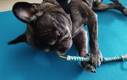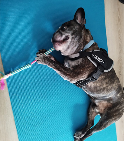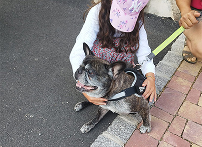Mango lebte problemlos mit einer Katze zusammen und ging manchmal mit zu den Eltern der Besitzerin, die auch eine französische Bulldogge hatten.