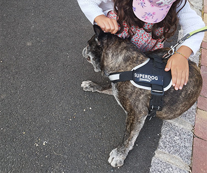 Mangos Gassigängerin unternimmt so einiges mit ihren Schützlingen.:) So war Mango mit in einem Restaurant und durfte, Bulldoggen like, auf dem Schoss Platz nehmen.