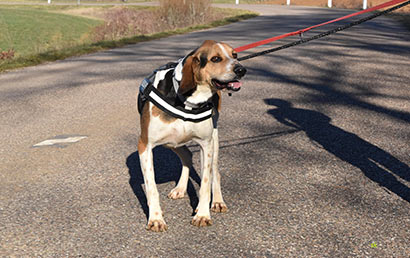 Er geht jetzt öfter mit seinen Rudelkollegen, Elite, Haddock, Zeep und Texas spazieren, sie vertragen sich alle gut und geniessen die Abwechslung in der Gruppe.