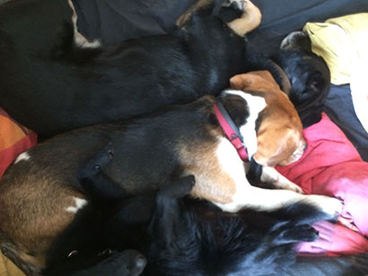Wegen Platzmangel im Tierheim müssen sich Feve, Mocca und Gibbs den Zwinger teilen.