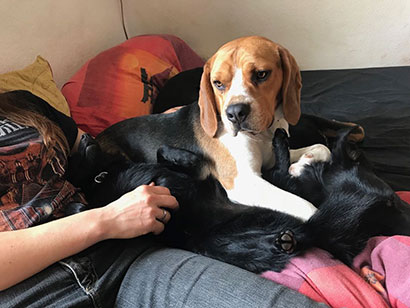 Mocca und Gibbs teilen sich einen Zwinger und gehen ohne Probleme gemeinsam Spazieren.