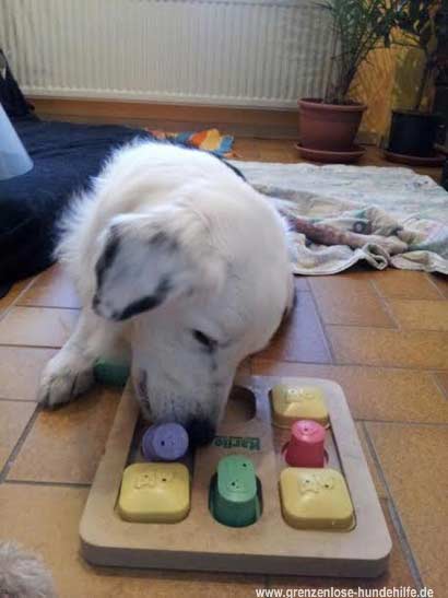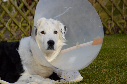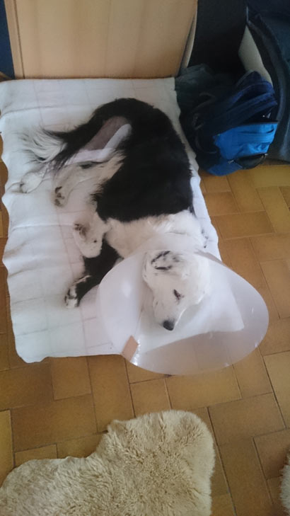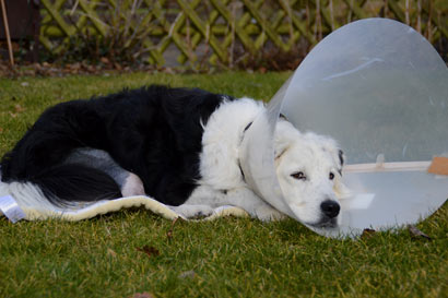 Er würde am liebsten schon wieder die großen Spaziergänge mitgehen, worauf er aber noch viele Wochen verzichten muss. Dafür darf er daheim Intelligenzspiele machen, um ihm seine Langweile zu vertreiben. Unter sehr strenger Aufsicht darf er auch mal ohne Kragen sein, damit er seine Vorderpfoten ausgiebig putzen, fressen oder auch mal entspannt schlafen kann. Jedoch muss man ihn dann immer im Auge behalten! Er schläft inzwischen die meisten Nächte auch durch, sodass er sich gut erholen kann.