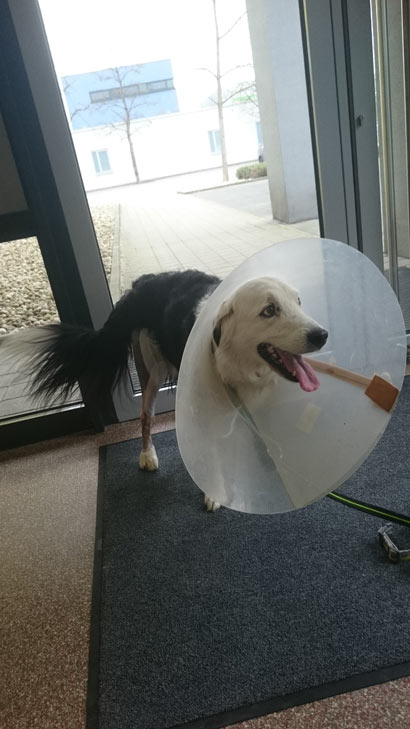 Max hat vor zwei Wochen Fäden gezogen bekommen, musste aber noch über eine Woche seinen Kragen danach tragen, da er meinte auf sich extrem rumbeißen zu müssen.
