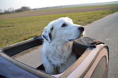 Damit Max die Zeit nicht so lang wird, darf er manchmal bei schönem Wetter in seinem Hundetaxi eine Runde draußen drehen. Dann kann er sitzend ein wenig von der Welt mitbekommen.