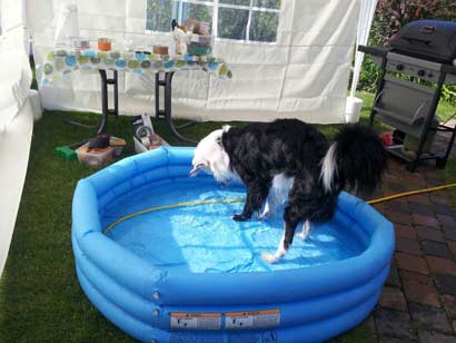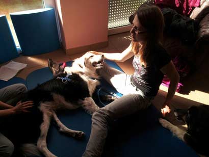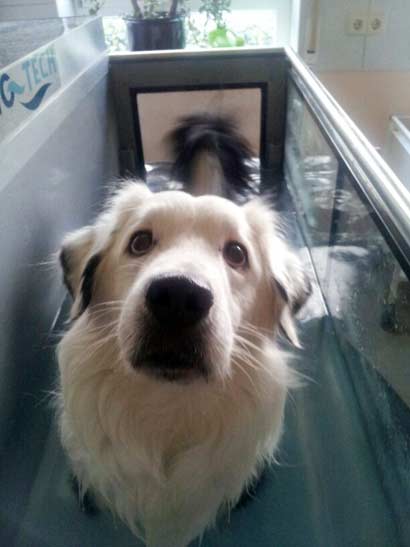 Aber irgendwann hatte ich es dann endlich geschafft, ich durfte wieder langsam anfangen zu laufen Nur durch das lange ruhige liegen war meine Muskulatur natürlich leider ziemlich abgebaut. Deshalb gehe ich nun mit meinem Pflegefrauchen fleißig jede Woche zur Physiotherapie, um dort in das Wasserlaufband zu gehen oder in dem Wasserbecken schwimmen zu gehen. Und ich muss Euch sagen, Wasser ist einfach sooo toll! Ich freu mich jedes Mal wie ein Schneekönig, wenn ich da hingehen darf! Und kaum ist die Tür zur Physiopraxis auf, muss ich natürlich erstmal schauen, ob denn das Wasser auch wirklich da ist! Die Physiotherapeutin sagt, ich mach tolle Fortschritte und bewege mein Bein immer besser. Und auch der Tierarzt war bei der Nachkontrolle im Dezember total zufrieden mit mir! Aber ich gehe ja nicht nur jede Woche zur Physiotherapie. Mein Pflegefrauchen ihr Freund hat extra für mich und meine Freundin Bonnie ein Wackelbrett gebaut. So kann mein Pflegefrauchen mit mir daheim auf dem Wackelbrett und mit einem Gymnastikball auch noch Physiotherapie machen. Sie hat das extra mit der Physiotherapie besprochen, damit sie nichts falsch macht. Und das mach ich so gerne, denn dann bekomme ich immer mal ein Leckerlie, wenn ich brav mitmache!
